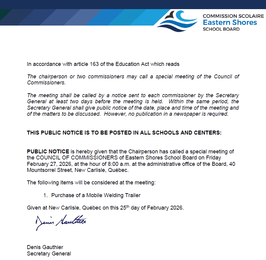 Eastern Shores School Board is currently seeking bids for snow removal services for the Baie-des-Chaleurs Regional School located at 67, Dover Street, New Carlisle QC.