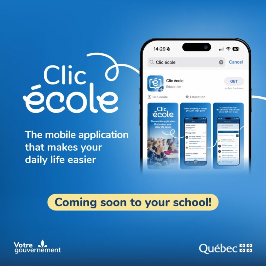 The Clic école mobile app is an initiative of the Quebec government, in collaboration with school organizations and partners in the education network, designed to ensure that the features offered