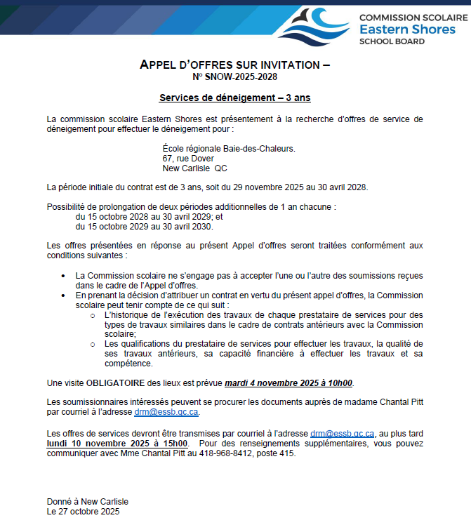 La commission scolaire Eastern Shores est présentement à la recherche d’offres de service de déneigement pour effectuer le déneigement pour l’École régionale Baie-des-Chaleurs située au 67, rue Dover, New Carlisle QC.